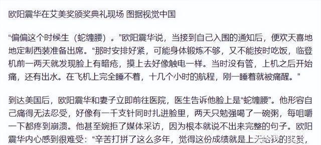 他从来没靠老婆家的资源,事业全靠自己打拼,老婆也不在乎他名气大不大,始终陪伴他左右,陪他度过两次生死难关。 近况 最近他接受采访,说出自己2007年去领奖时鼻子通红的原因,是患上了“蛇缠腰”,俗称带状疱疹。 大家听名字可能觉得小题大做,但其实这种病看程度、看位置,他的病症在眼睛周围,发作起来痛不欲生,还会影响器官功能。